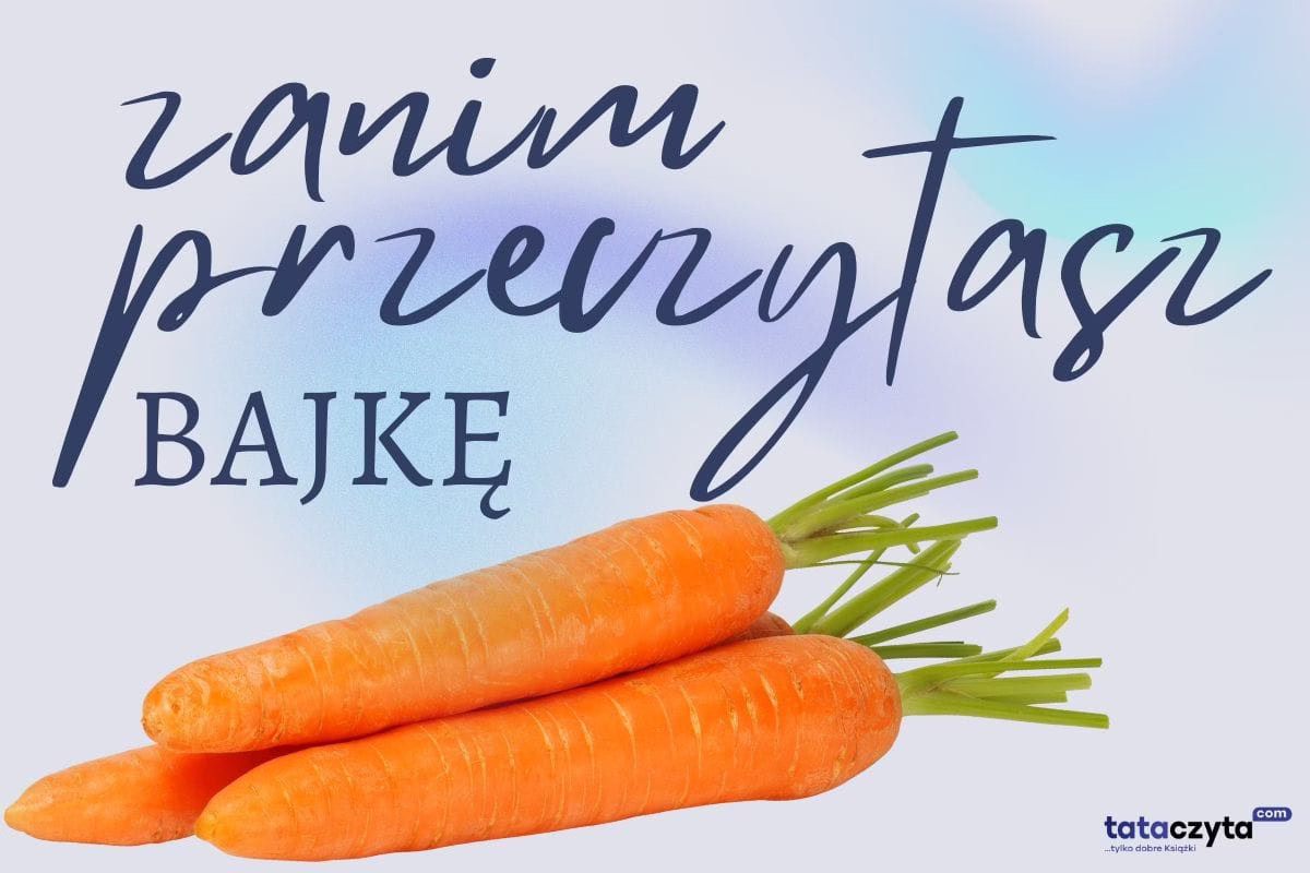 Grafika z napisem "Zanim przeczytasz bajkę" i trzema świeżymi marchewkami – metafora codziennej troski o dzieci, także przez czytanie książek.